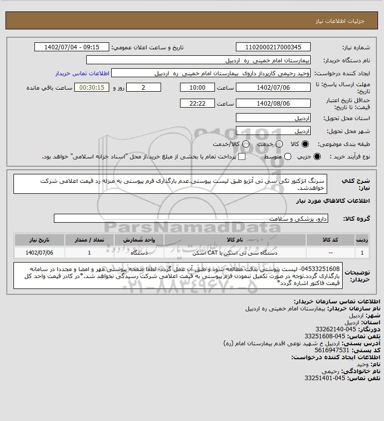 | 1 | -- | دستگاه سی تی اسکن یا CAT اسکن | دستگاه | 1 | 1402/07/06 |