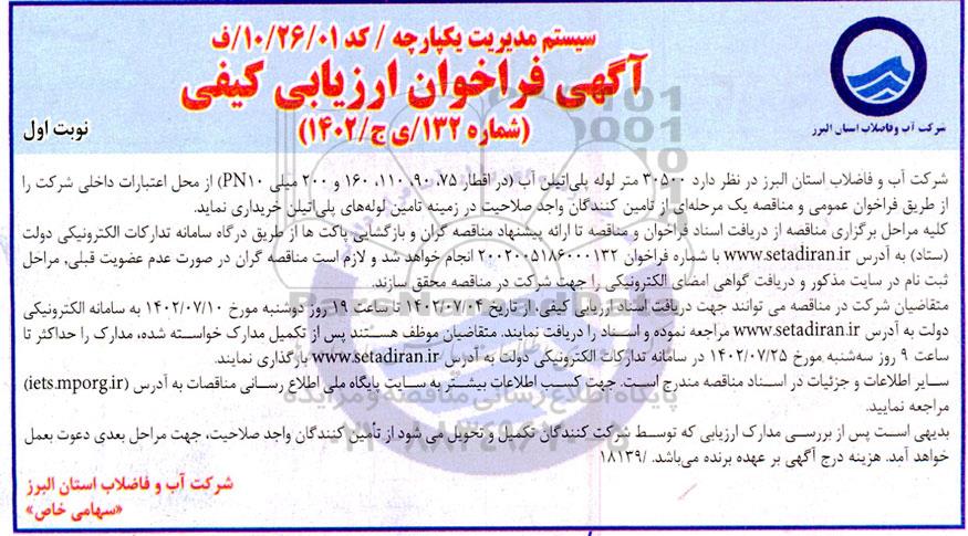 شرکت آب و فاضلاب استان البرز در نظر دارد 30500 متر لوله پلی اتیلن آب (در اقطار 75،90، 110، 160 و 200 میلی PN10) از محل اعتبارات داخلی شرکت را از طریق فراخوان عمومی و مناقصه یک مرحله ای از تامین کنندگان واجد صلاحیت در زمینه تامین لوله های پلی اتیلن خریداری ناید.