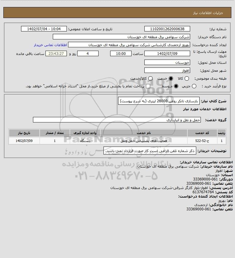 شرح کلی نیاز: بازسازی تانکر روغن 28000 لیتری (به شرح پیوست)