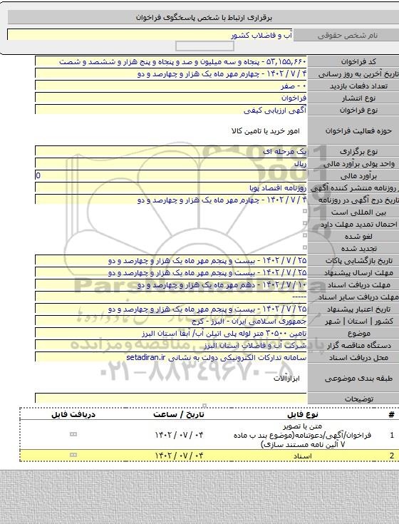 این مناقصه در تاریخ 1402/07/04 شروع و مهلت آن تا تاریخ 1402/07/10 میباشد.