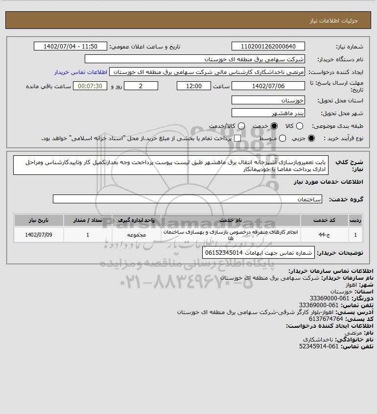 شرح کلی نیاز: بابت تعمیروبازسازی آشپزخانه انتقال برق ماهشهر طبق لیست پیوست پرداخحت وجه بعدازتکمیل کار وتاییدکارشناس ومراحل اداری پرداخت مفاصا با خودپیمانکار