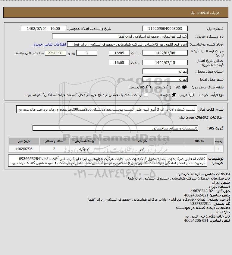 شرح کلی نیاز: لیست شماره 08 دارای 3 آیتم ابنیه طبق لیست پیوست،تعداد2بشکه،350عدد،200متر،نحوه و زمان پرداخت مالی:ده روز