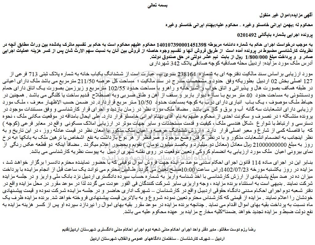 بنابر این در اجرای ماده 114 قانون اجرای احکام مدنی موعد مزایده جهت فروش اموال توقیفی که با حضور نماینده محترم دادسرا برگزار خواهد شد ، مزایده در روز یکشنبه مورخه 1402/07/23راس ساعت 10:00صبح تعیین می گردد. طالبین محترم می تواند یک ساعت قبل از انجام مزایده با پرداخت میزان ده در صد مبلغ پشنهادی از ارزش کارشناسی با اخذ شناسه واریز به شماره حساب سپرده دادگستری اردبیل نزد بانک ملی واریز و در جلسه مزایده شرکت نمایند . بدیهی است به استثناء برنده مزایده ، وجه واریزی سایر شرکت کنندگان فی الفور عودت می گردد لذا در موعد مقرر در محل مزایده واقع در دفتر شعبه دوم اجرای احکام مدنی دادگاه حقوقی اردبیل واقع در کارشناسان – شهرک اداری حاضر و در جلسه مزایده شرکت نموده و قیمت پیشنهادی خودشان را اعلام نمایند . مزایده از قیمتی که کارشناس محترم تعیین نموده شروع و به بالاترین قیمت پیشنهادی فروخته خواهد شد. برنده مزایده ظرف یک ماه نسبت به پرداخت بقیه بهای اموال اقدام می نماید . چنانچه برنده مزایده در موعد مقرر بقیه بهای اموال را نپردازد سپرده او پس از کسر هزینه مزایده به نفع دولت ضبط و مزایده تجدید خواهد .ضمنا"کلیه مخارج مزایده بر عهده محکوم علیه می باشد.