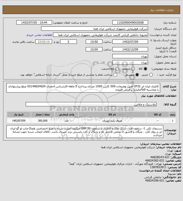 شرح کلی نیاز: کاتلری ایران ایر CP32 طبق توضیحات-300 کارتن 1000 عددی پرداخت 5 ماهه-کارشناس احمدی 02146624624 مبلغ پیشنهادی با محاسبه 9%مالیات بر ارزش افزوده