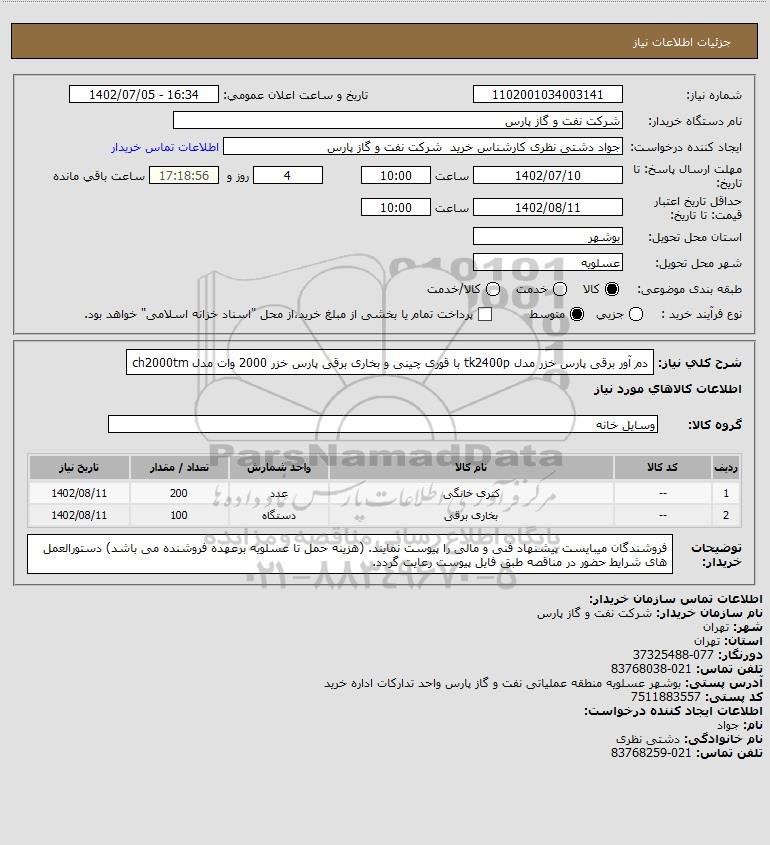 شرح کلی نیاز: دم آور برقی پارس خزر مدل tk2400p با قوری چینی و بخاری برقی پارس خزر 2000 وات مدل ch2000tm
