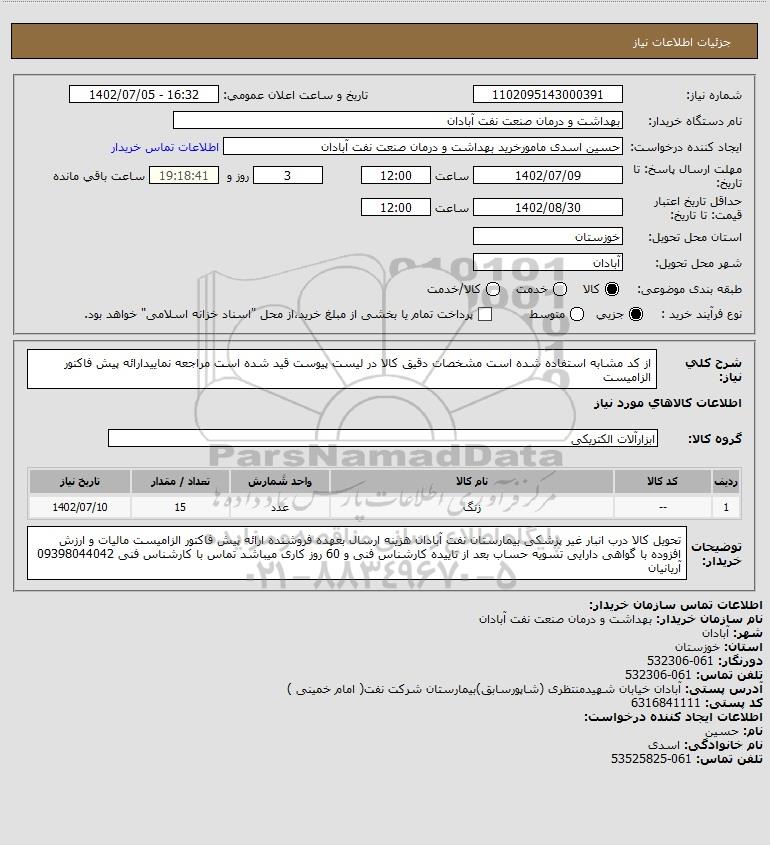 نام دستگاه خریدار:بهداشت و درمان صنعت نفت آبادان