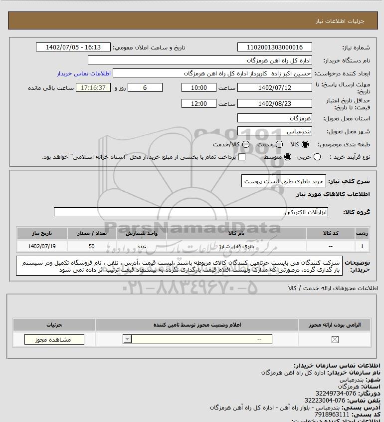 | 1 | -- | باتری قابل شارژ | عدد | 50 | 1402/07/19 |