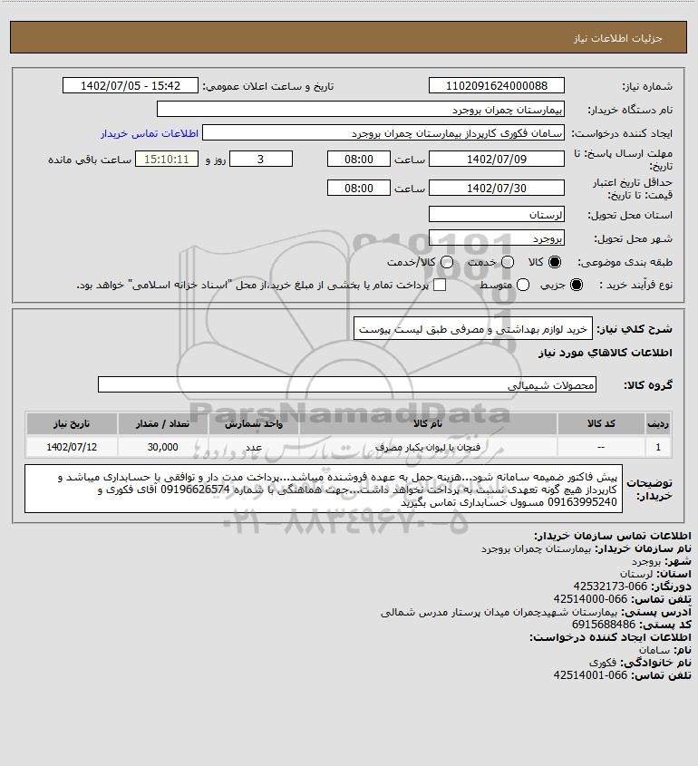 شرح کلی نیاز: خرید لوازم بهداشتی و مصرفی طبق لیست پیوست