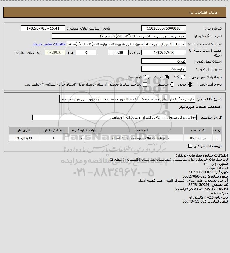 شرح کلی نیاز: طرح پیشگیری از تنبلی چشم کودکان 3تا6سال ریز خدمت به مدارک پیوستی مراجعه شود