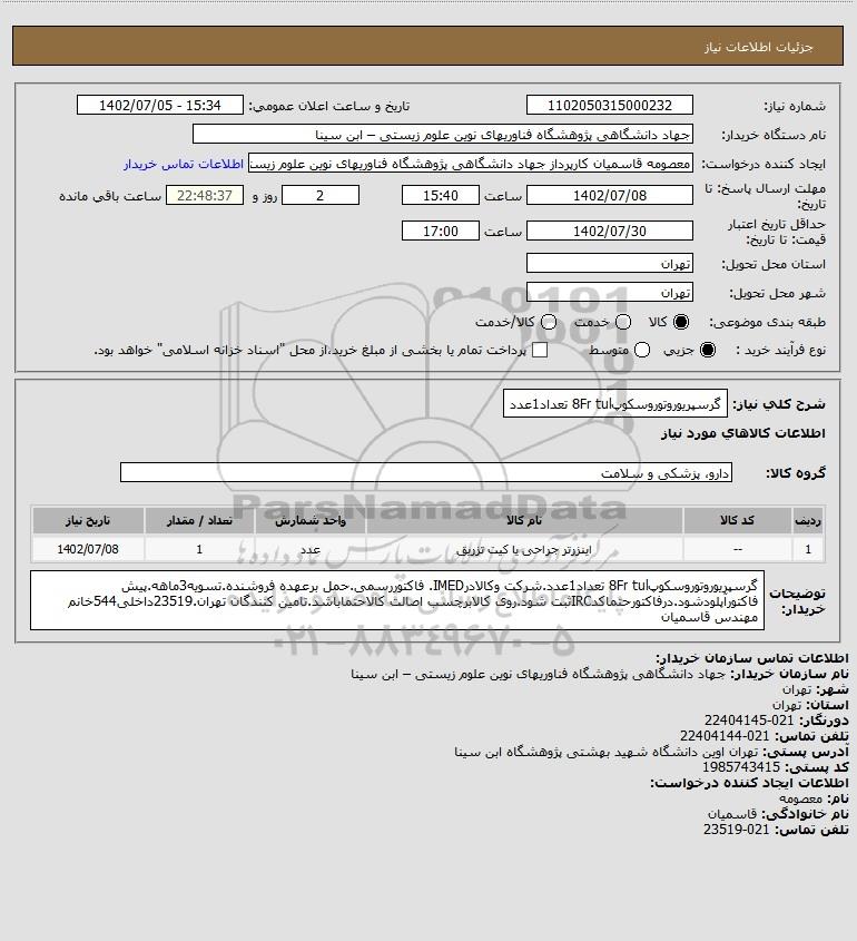 شرح کلی نیاز: گرسپریوروتوروسکوپ8Fr tul تعداد1عدد