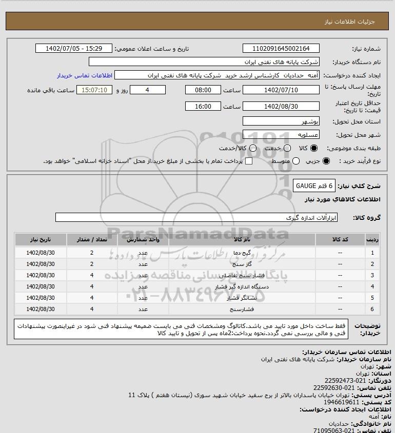 استعلام بها و موضوع استعلام استعلام 6 قلم GAUGE به اطلاع کلیه شرکت‌ها و افراد متخصص واجد شرایط می‌رساند، آگهی گذار در نظر دارد از طریق استعلام بها، نسبت به انتخاب و دریافت پیشنهادات اقدام نماید. این استعلام با کد آگهی ثبت شده در سامانه خبرگزاری پارس نماد : 6396492 منتشر شده است. مشخصات استعلام : تاریخ شروع استعلام: 1402/07/05 آخرین مهلت ارسال پیشنهاد قیمت : 1402/07/10 و محل اجرای پروژه : استان بوشهر میباشد. استعلام قیمت مورد درخواست : استعلام 6 قلم GAUGE با دسته‌بندی‌های تخصصی و گروه های مرتبط : ابزار دقیق, تجهیزات نفت و گاز, استعلام اطلاع رسانی میگردد.