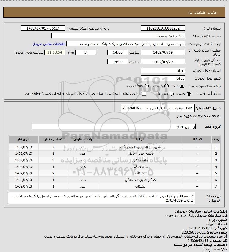 شرح کلی نیاز: کالای درخواستی طبق فایل پیوست.27874039