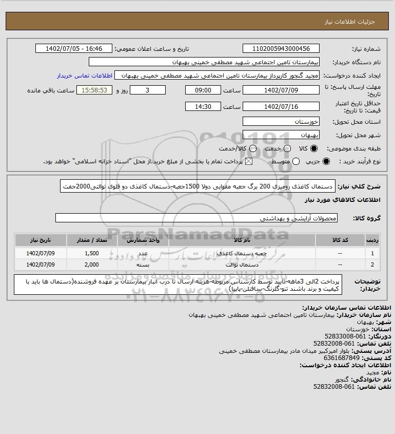 | 2 | -- | دستمال توالت | بسته | 2,000 | 1402/07/09 |