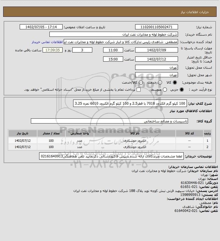 استعلام 100 کیلو گرم الکترود 7018 با قطر2.5 و 100 کیلو گرم الکترود 6010 نمره 3.25, استعلام 100 کیلو گرم الکترود 7018 با قطر2.5 و 100 کیلو گرم الکترود 6010 نمره 3.25
