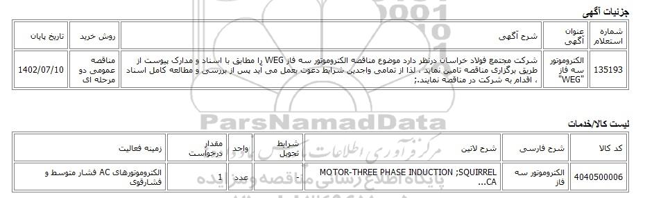 135193الکتروموتور سه فاز "WEG"شرکت مجتمع فولاد خراسان درنظر دارد موضوع مناقصه الکتروموتور سه فاز WEG را مطابق با اسناد و مدارک پیوست از طریق برگزاری مناقصه تامین نماید ، لذا از تمامی واجدین شرایط دعوت بعمل می آید پس از بررسی و مطالعه کامل اسناد ، اقدام به شرکت در مناقصه نمایند.;مناقصه عمومی دو مرحله ای1402/07/10