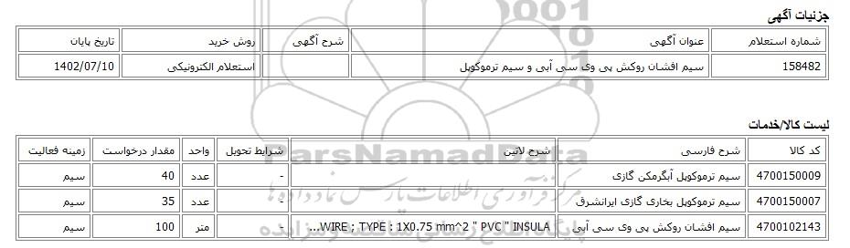 | 158482 | سیم افشان روکش پی وی سی آبی و سیم ترموکوپل | استعلام الکترونیکی | 1402/07/10 |