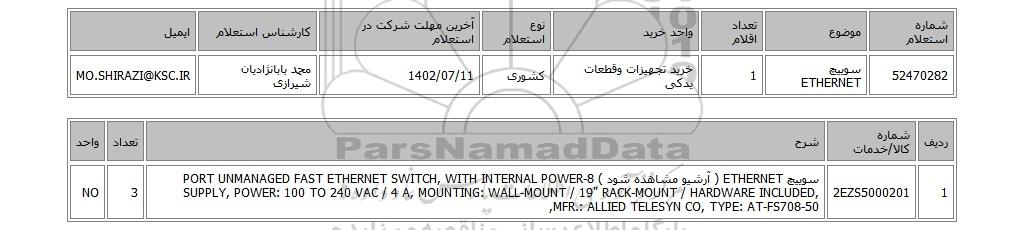 | 52470282 | سوییچ ETHERNET | 1 | خرید تجهیزات وقطعات یدکی | کشوری | 1402/07/11 | محمد بابانژادیان شیرازی | MO.SHIRAZI@KSC.IR |