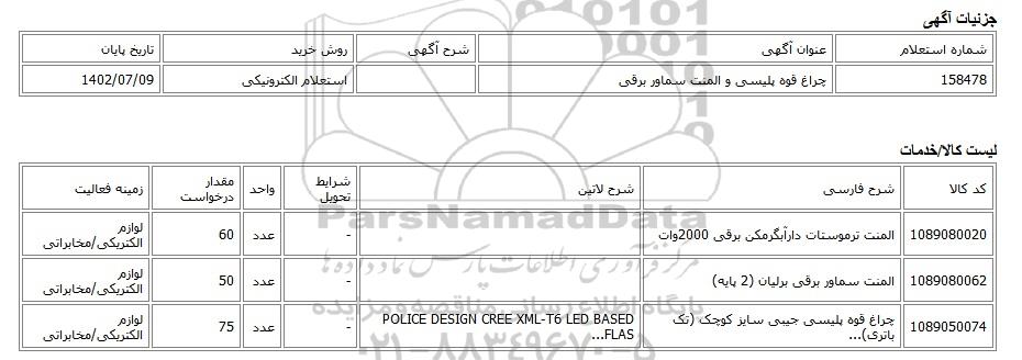 | 158478 | چراغ قوه پلیسی و المنت سماور برقی | استعلام الکترونیکی | 1402/07/09 |