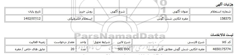 | 158375 | مقره اتکایی شش گوش | استعلام الکترونیکی | 1402/07/12 |