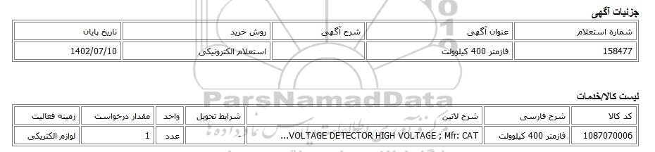 | 158477 | فازمتر 400 کیلوولت | استعلام الکترونیکی | 1402/07/10 |