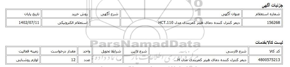 | 156268 | دیمر کنترل کننده دمای هیتر کمربندی مدل HCT.110 | استعلام الکترونیکی | 1402/07/11 |