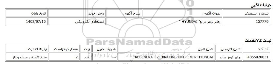 | 157779 | چاپر ترمز درایو" HYUNDAI " | استعلام الکترونیکی | 1402/07/10 |