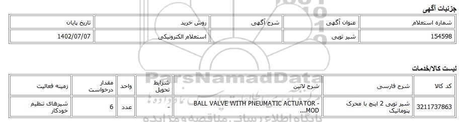 | 154598 | شیر توپی | استعلام الکترونیکی | 1402/07/07 |