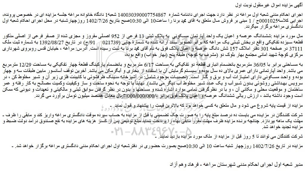 - مزایده در تاریخ 1402/7/26 روزچهار شنبه ساعت 10 الی 10:30صبح بصورت حضوری در دفترشعبه اول اجرای احکام مدنی دادگستری مراغه برگزار خواهد شد.