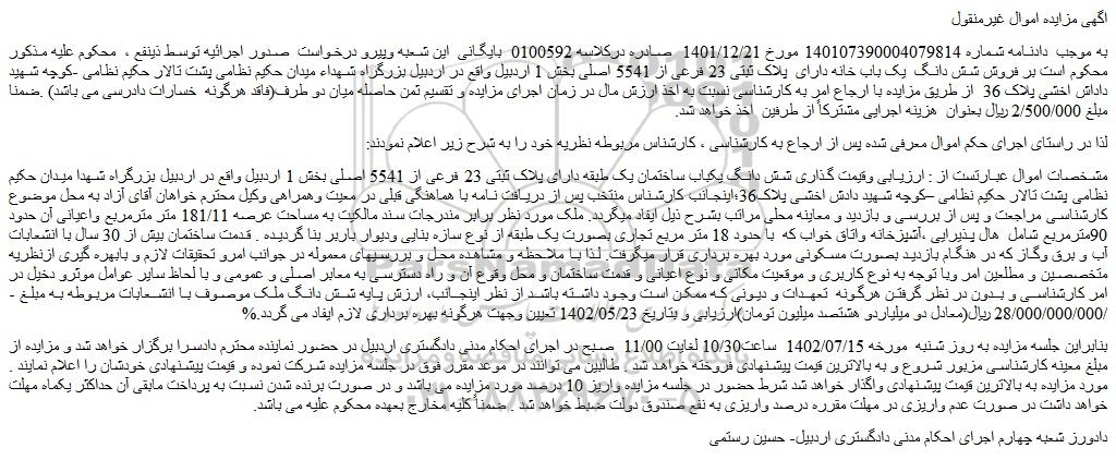 به موجب دادنامه شماره 140107390004079814 مورخ 1401/12/21 صادره درکلاسه 0100592 بایگانی این شعبه وپیرو درخواست صدور اجرائیه توسط ذینفع ، محکوم علیه مذکور محکوم است بر فروش شش دانگ یک باب خانه دارای پلاک ثبتی 23 فرعی از 5541 اصلی بخش 1 اردبیل واقع در اردبیل بزرگراه شهداء میدان حکیم نظامی پشت تالار حکیم نظامی -کوچه شهید داداش اخشی پلاک 36 از طریق مزایده با ارجاع امر به کارشناسی نسبت به اخذ ارزش مال در زمان اجرای مزایده و تقسیم ثمن حاصله میان دو طرف(فاقد هرگونه خسارات دادرسی می باشد) .ضمنا مبلغ 2/500/000 ریال بعنوان هزینه اجرایی مشترکاً از طرفین اخذ خواهد شد.