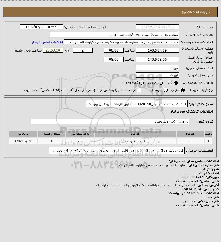 توضیحات خریدار:استنت سلف اکسپندیبل40*20(1عدد)طبق الزامات خریدفایل پیوست09127034749حسینی