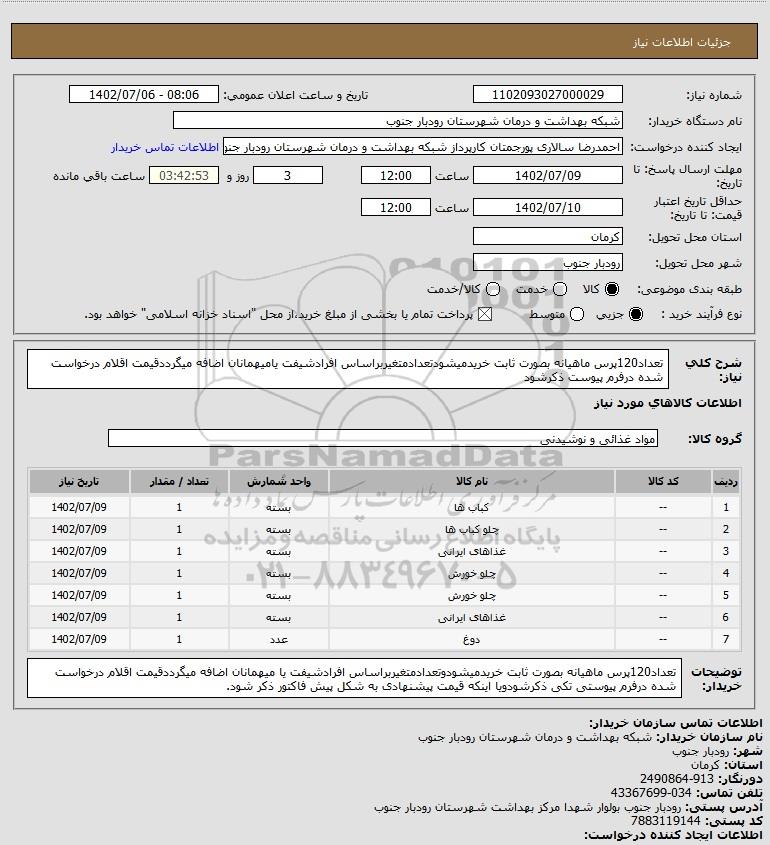 توضیحات خریدار:تعداد120پرس ماهیانه بصورت ثابت خریدمیشودوتعدادمتغیربراساس افرادشیفت یا میهمانان اضافه میگرددقیمت اقلام درخواست شده درفرم پیوستی تکی ذکرشودویا اینکه قیمت پیشنهادی به شکل پیش فاکتور ذکر شود.