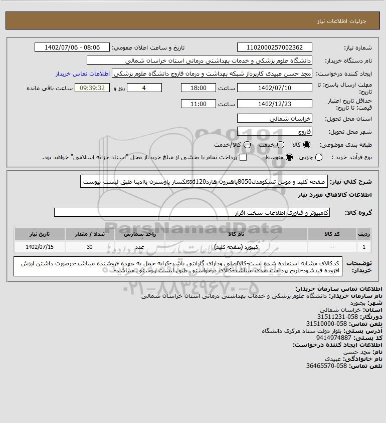 نام دستگاه خریدار:دانشگاه علوم پزشکی و خدمات بهداشتی درمانی استان خراسان شمالی