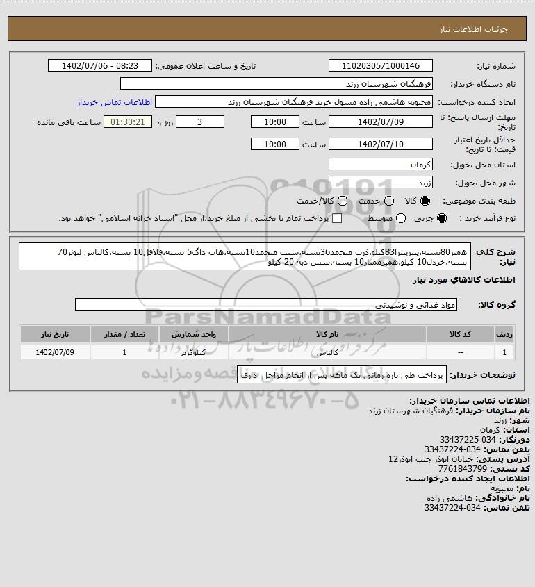 شرح کلی نیاز: همبر80بسته،پنیرپیتزا83کیلو،ذرت منجمد36بسته،سیب منجمد10بسته،هات داگ5 بسته،فلافل10 بسته،کالباس لیونر70 بسته،خردل10 کیلو،همبرممتاز10 بسته،سس دبه 20 کیلو