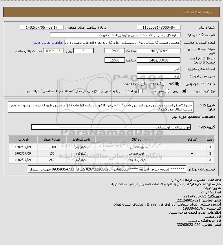 | 1 | -- | سبزیجات منجمد | کیلوگرم | 5,000 | 1402/07/09 |