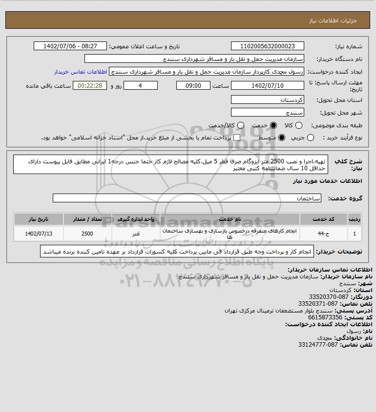 نام دستگاه خریدار:سازمان مدیریت حمل و نقل بار و مسافر شهرداری سنندج