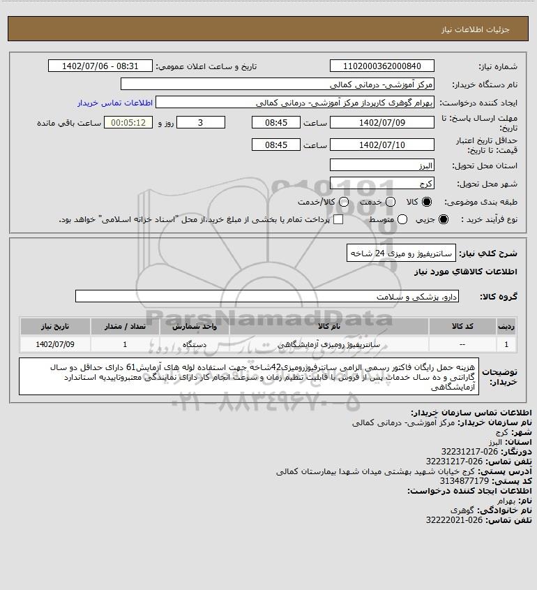 | 1 | -- | سانتریفیوژ رومیزی آزمایشگاهی | دستگاه | 1 | 1402/07/09 |
