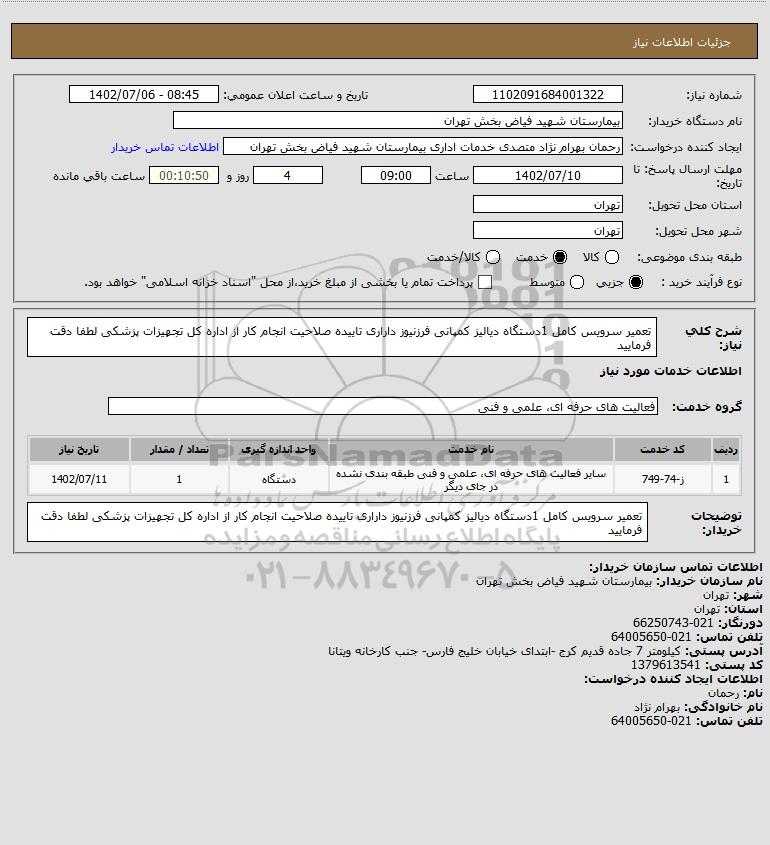 نام دستگاه خریدار:بیمارستان شهید فیاض بخش تهران