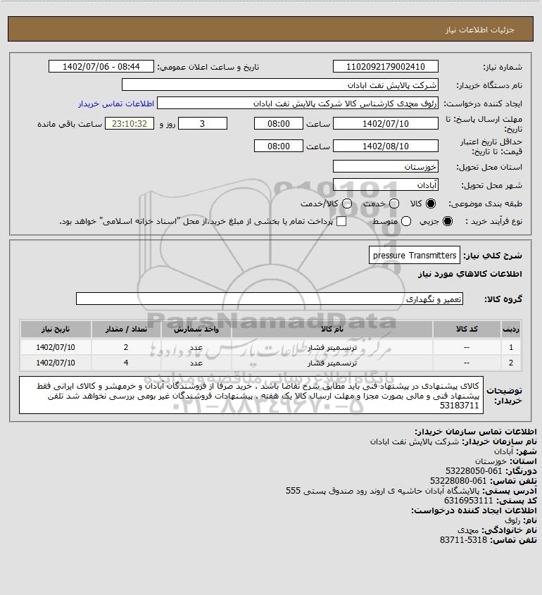 | 1 | -- | ترنسمیتر فشار | عدد | 2 | 1402/07/10 |