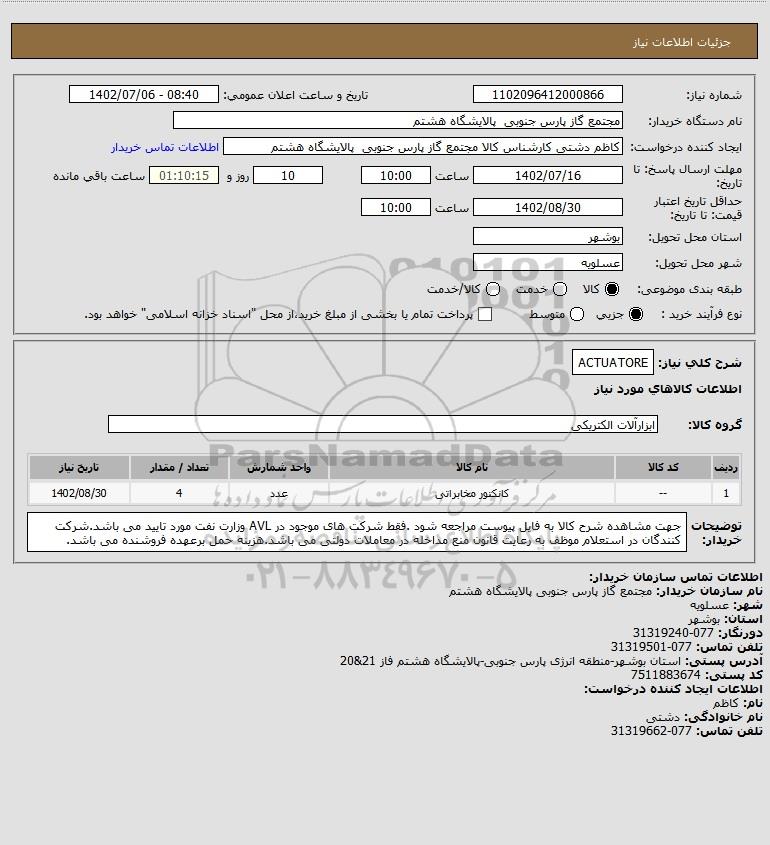 نام دستگاه خریدار:مجتمع گاز پارس جنوبی پالایشگاه هشتم