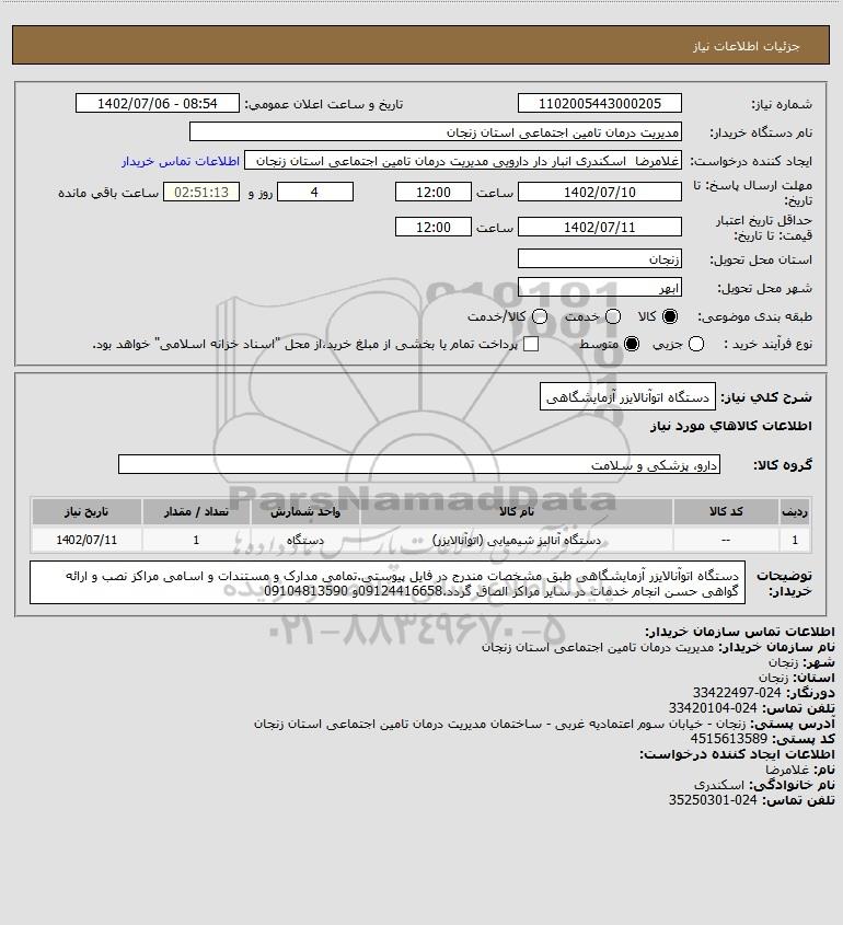 | 1 | -- | دستگاه آنالیز شیمیایی (اتوآنالایزر) | دستگاه | 1 | 1402/07/11 |