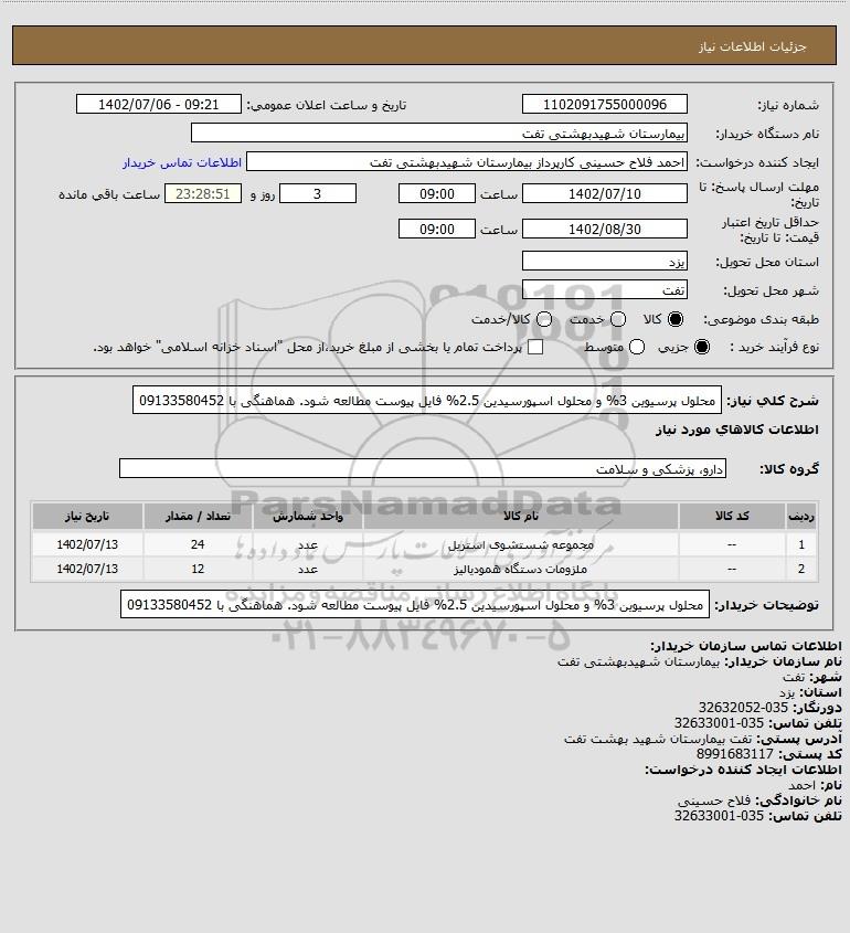 استعلام بها و موضوع استعلام استعلام محلول پرسیوین 3% و محلول اسپورسیدین 2.5% فایل پیوست مطالعه شود. هماهنگی با 09133580452 به اطلاع کلیه شرکتها و افراد متخصص واجد شرایط میرساند، آگهی گذار در نظر دارد از طریق استعلام بها، نسبت به انتخاب و دریافت پیشنهادات اقدام نماید. این استعلام با کد آگهی ثبت شده در سامانه خبرگزاری پارس نماد : 6398107 منتشر شده است. مشخصات استعلام : تاریخ شروع استعلام: 1402/07/06 آخرین مهلت ارسال پیشنهاد قیمت : 1402/07/10 و محل اجرای پروژه : استان یزد میباشد. استعلام قیمت مورد درخواست : استعلام محلول پرسیوین 3% و محلول اسپورسیدین 2.5% فایل پیوست مطالعه شود. هماهنگی با 09133580452 با دستهبندیهای تخصصی و گروه های مرتبط : خدمات و تجهیزات آزمایشگاهی و پزشکی, استعلام اطلاع رسانی میگردد.