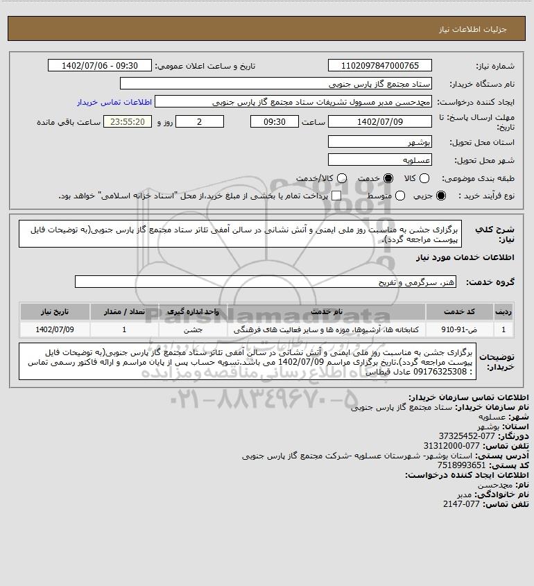 توضیحات خریدار:برگزاری جشن به مناسبت روز ملی ایمنی و آتش نشانی در سالن آمفی تئاتر ستاد مجتمع گاز پارس جنوبی(به توضیحات فایل پیوست مراجعه گردد).تاریخ برگزاری مراسم 1402/07/09 می باشد.تسویه حساب پس از پایان مراسم و ارائه فاکتور رسمی تماس : 09176325308 عادل قیطاس