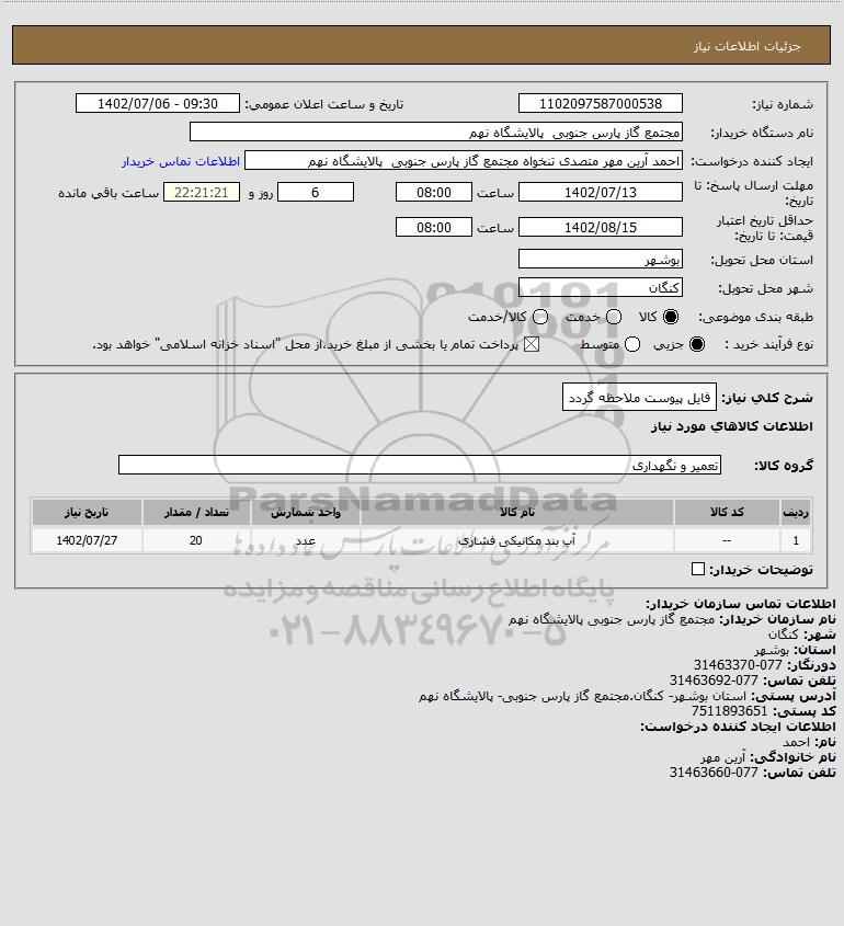 | 1 | -- | آب بند مکانیکی فشاری | عدد | 20 | 1402/07/27 |