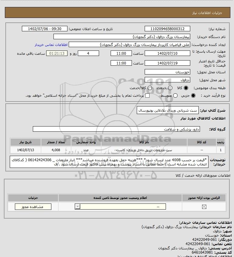 شرح کلی نیاز: ست شریانی وریدی بلادلاین یونیورسال