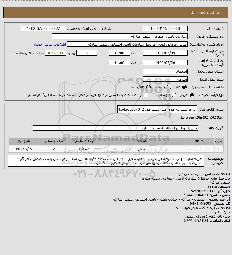 شرح کلی نیاز: درخواست دو عدد جت اسکنر مدارک kodak s2070
