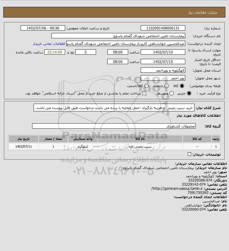 نام سازمان خریدار: بیمارستان تامین اجتماعی شهدای گمنام یاسوج