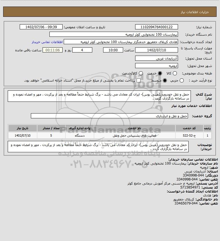 شرح کلی نیاز: حمل و نقل خودرویی(مینی بوس)- ایران کد معادل می باشد - برگ شرایط حتماً مطالعه و بعد از پرکردن ، مهر و امضاء نموده و در سامانه بارگزاری گردد .