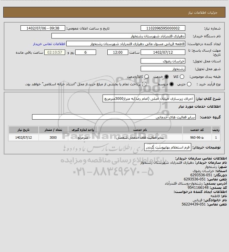 نام دستگاه خریدار:دهیاری قلندراباد شهرستان رشتخوار