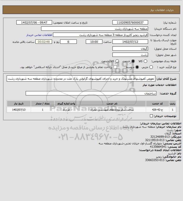 شرح کلی نیاز: تعویض کفپوشهای مستهلک و خرید و اجرای کفپوشهای گرانولی پارک ملت در محدوده شهرداری منطقه سه شهرداری رشت