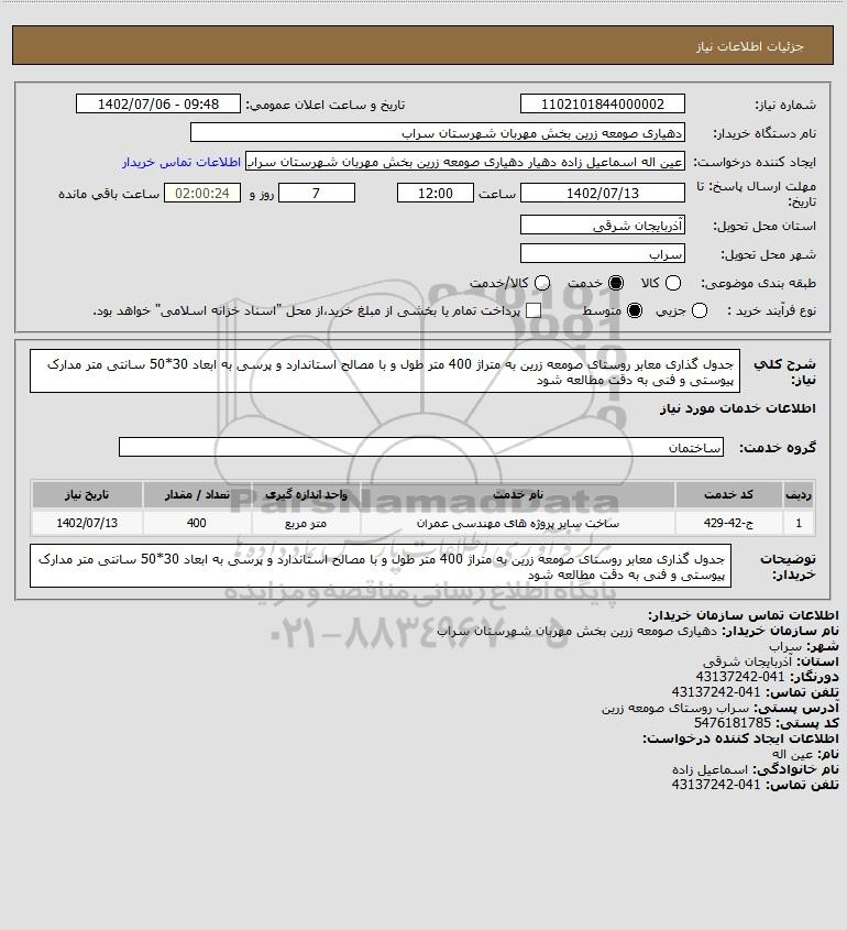 شرح کلی نیاز: جدول گذاری معابر روستای صومعه زرین به متراژ 400 متر طول و با مصالح استاندارد و پرسی به ابعاد 30*50 سانتی متر مدارک پیوستی و فنی به دقت مطالعه شود
